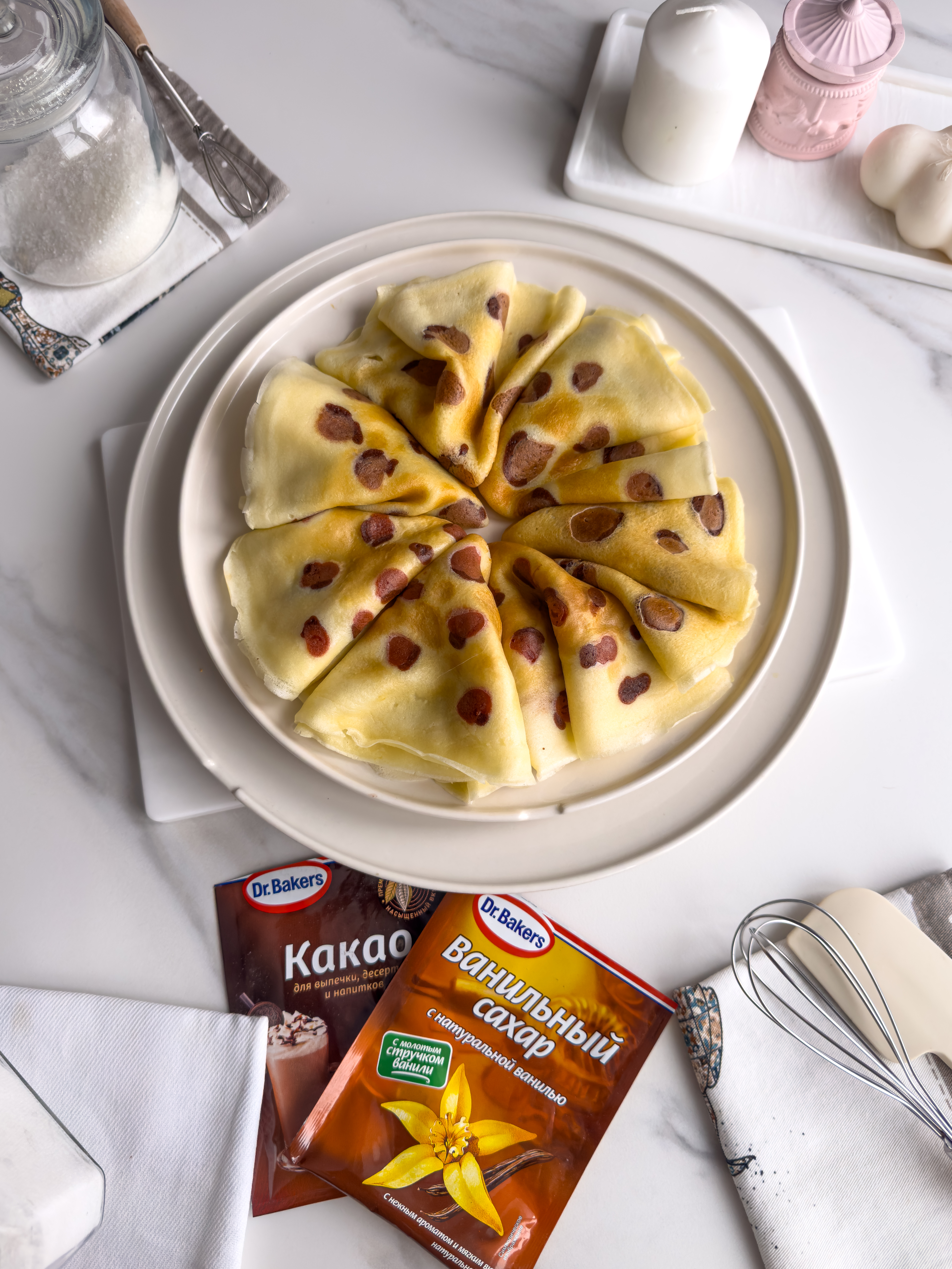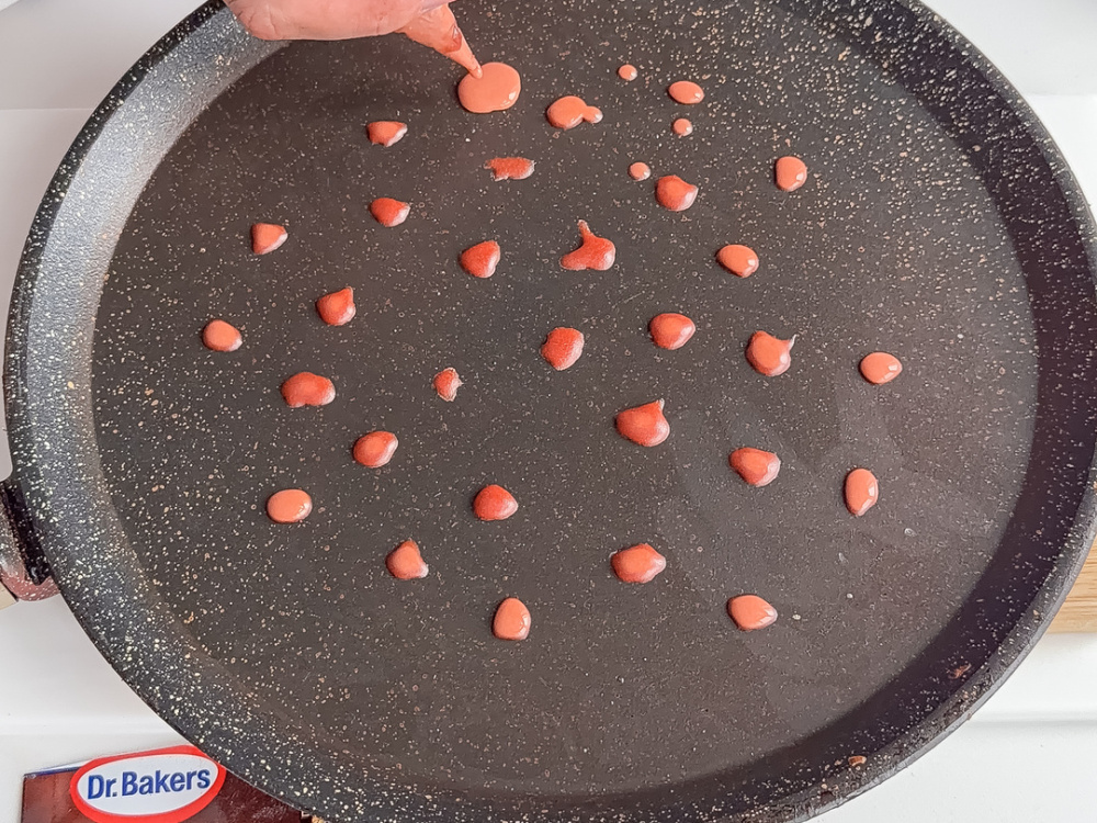 На сковороде (d 26 см.) нагретой на среднем огне оставляем много небольших точек из теста посветлее, затем добавляем орнамент из тёмного теста. Сверху заливаем тестом без какао-порошка и выпекаем с обеих стороны. Блины (5 порций по 2 шт.) получаются тонкие и нежные (10 шт.). После выпечки можно по желанию смазать сливочным маслом (50 г).