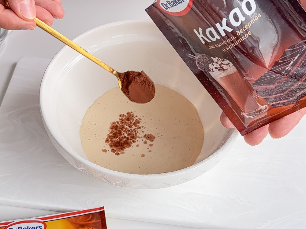 Отделяем две небольшие части теста и добавляем в первую часть какао-порошок Dr. Bakers (7 г), во вторую - оставшийся какао-порошок Dr. Bakers (18 г), чтобы получилась разная интенсивность окраски. Перекладываем в кондитерские мешки и срезаем небольшой кончик.