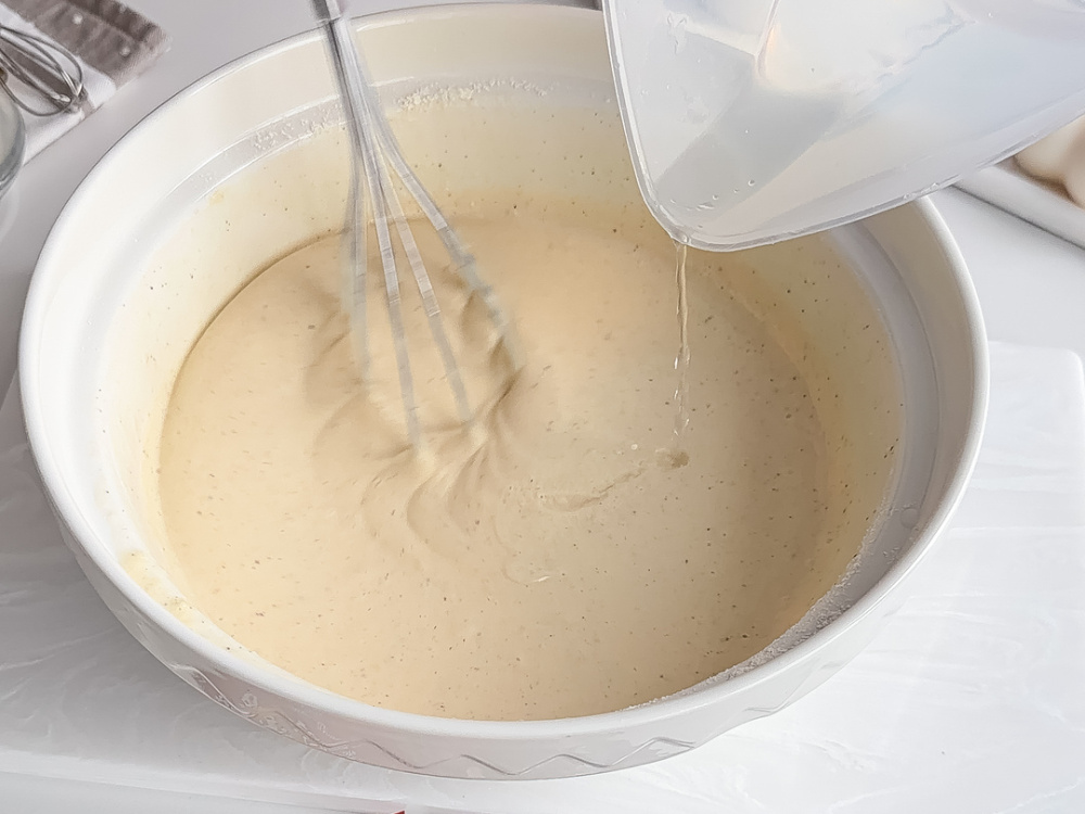Добавляем воду, разогретую до температуры 100°C (150 мл), хорошо смешиваем.