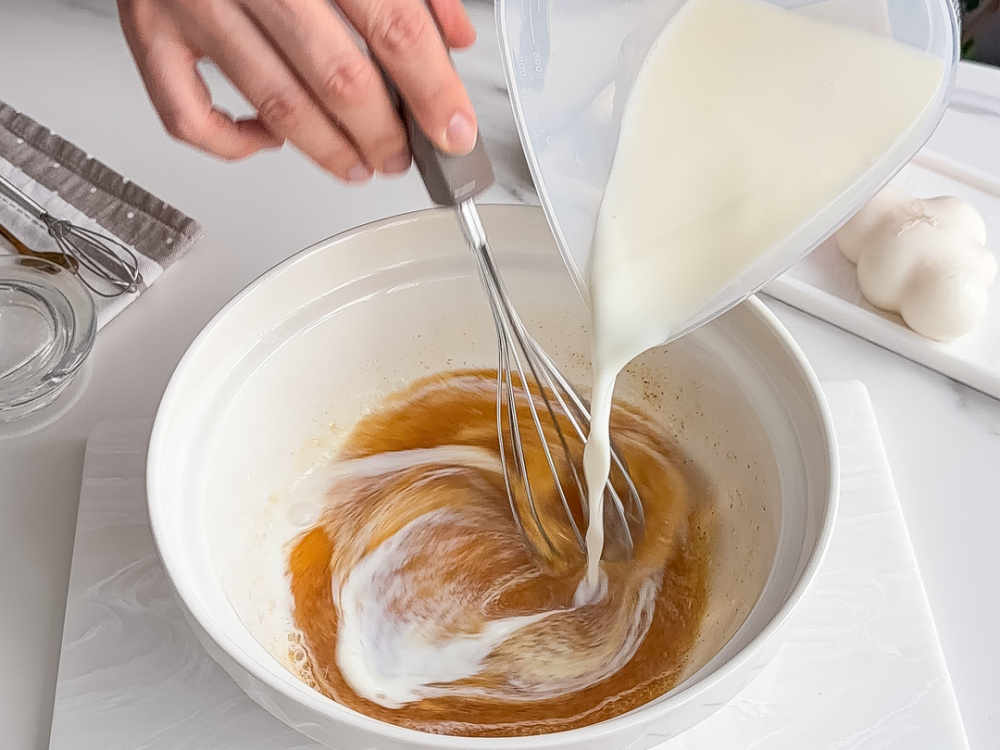 Добавляем растительное масло (60 г) и молоко (250 г) комнатной температуры и смешиваем.