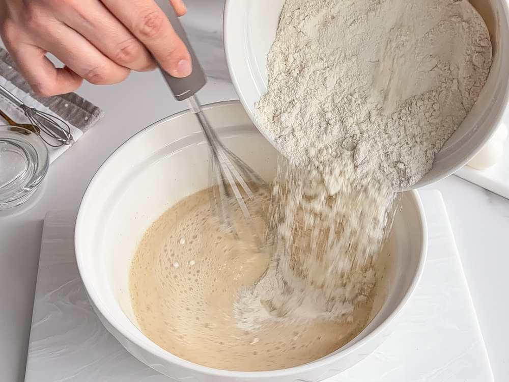 К получившейся массе, помешивая частями добавляем муку (210 г). Хорошо смешиваем, чтобы не было комочков.