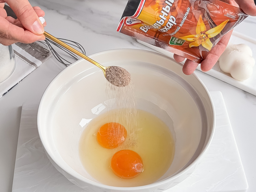 Яйцо (2 шт.) взбиваем с сахаром с натуральной ванилью Dr. Bakers (15 г), солью (3 г) и сахаром (15 г).