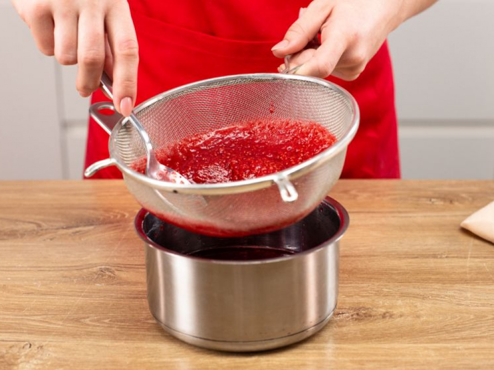 Варить 2-3 минуты или до полного растворения сахара. Снять с огня, дать немного остыть и пюрировать с помощью блендера. Пропустить соус через сито и вернуть в сотейник.