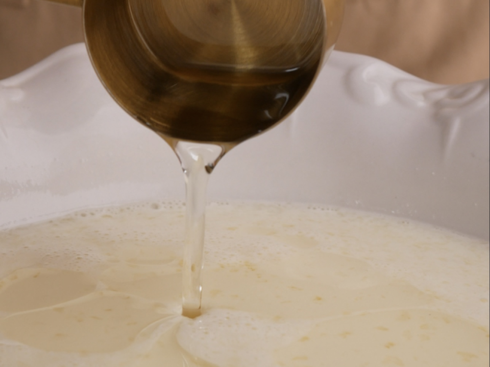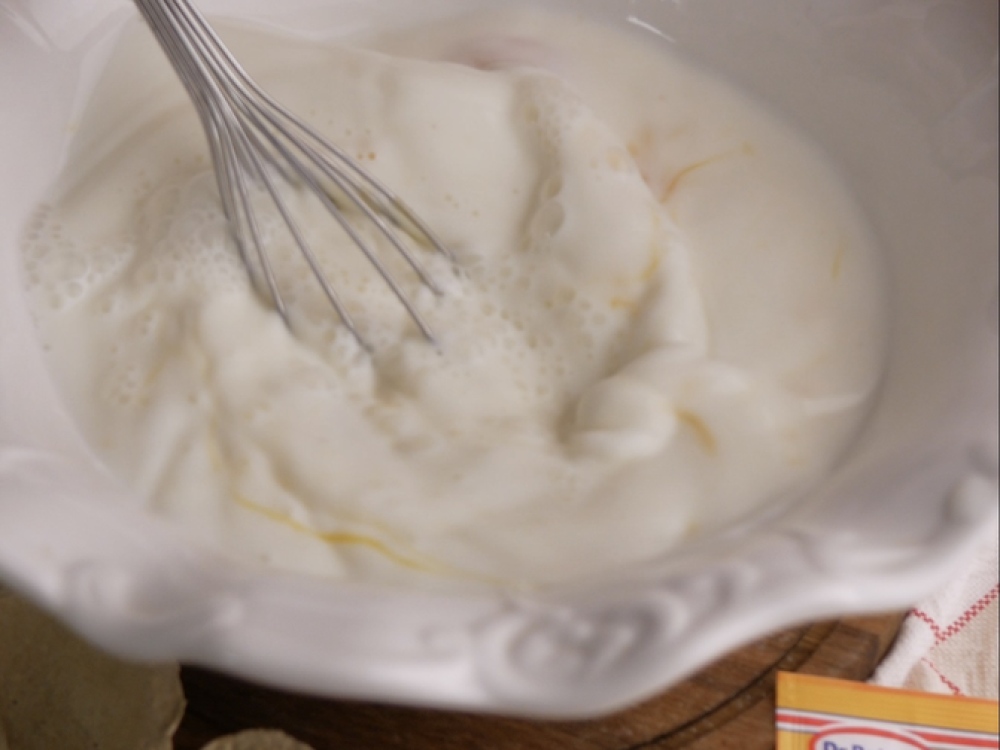 Готовим тесто. Молоко (500 мл) смешиваем венчиком с яйцом (2 шт.), щепоткой соли, сахаром (2 ст. л.) и ванильным сахаром Dr. Bakers (8 г). Вливаем растительное масло (2 ст. л.).
