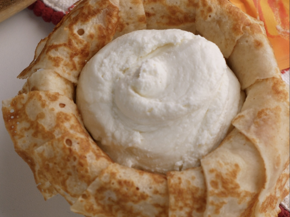 Кладём блин в пиалу или форму для маффинов. Плотно наполняем творожной начинкой и сворачиваем края. Вынимаем из формы.