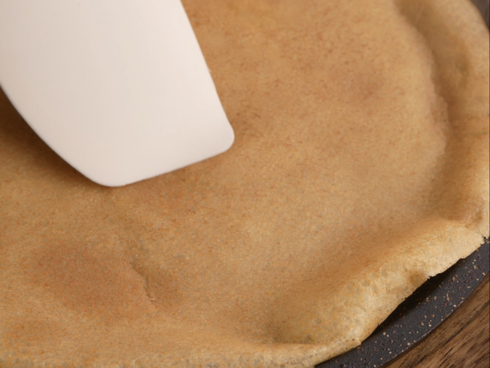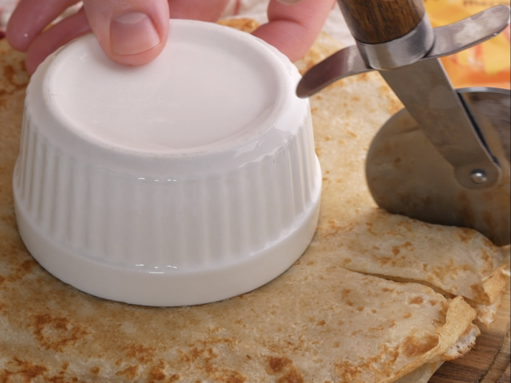 Укладываем блинчики румяной стороной вниз, ставим по центру небольшую пиалу в качестве ограничителя и нарезаем края блинов на лучи.