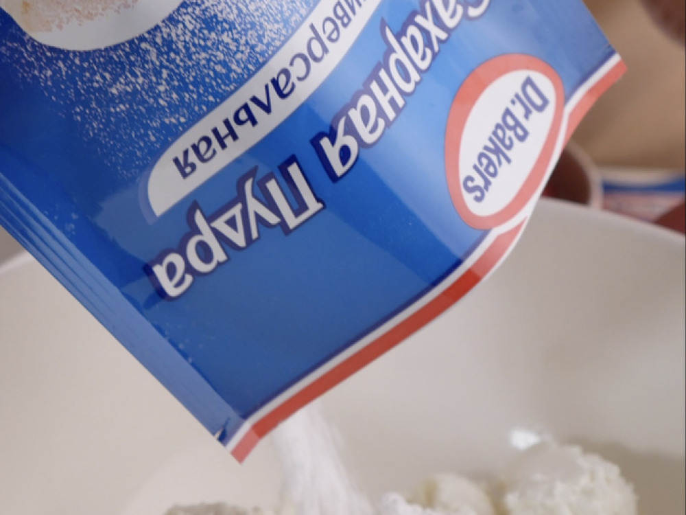 Готовим начинку. К творогу (500 г) добавляем сахарную пудру Dr. Bakers (1 уп.) и пробиваем массу блендером. Перекладываем в кондитерский мешок.