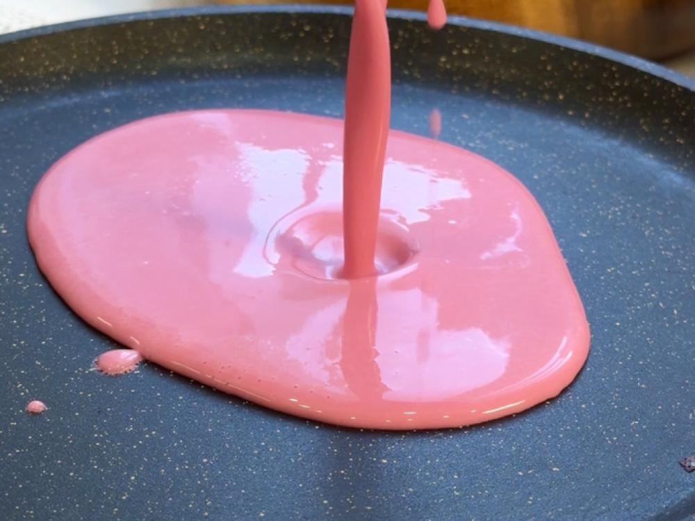 Выливаем оставшееся молоко (150 мл), воду 100°C (300 мл) и растительное масло (2 ст. л.). Венчиком замешиваем тесто. Делим тесто пополам. В одну половину теста высыпаем розовый ванильный сахар Dr. Bakers (1 уп.) и тщательно перемешиваем. Во вторую половину добавляем просеянный какао-порошок Dr. Bakers (1 уп.) и тоже тщательно перемешиваем. Даём тесту постоять 10 минут.