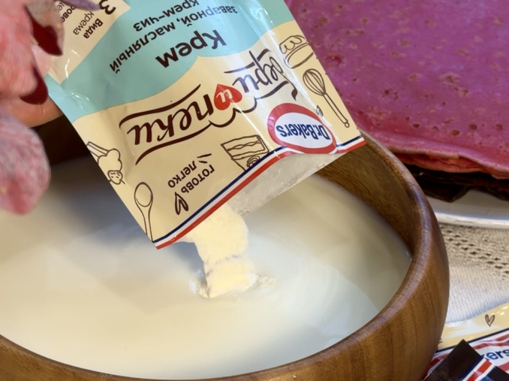 Пока блины остывают, готовим заварной крем. В холодное молоко (400 мл) высыпаем смесь «Бери и пеки. Крем заварной, масляный и крем-чиз». Перемешиваем и варим до загустения. В готовый крем добавляем сливочное масло (40 г) и перемешиваем. Остужаем крем под плёнкой.