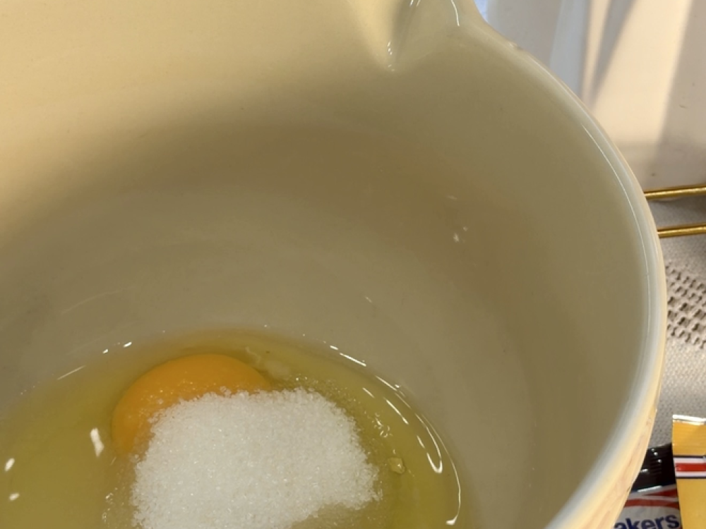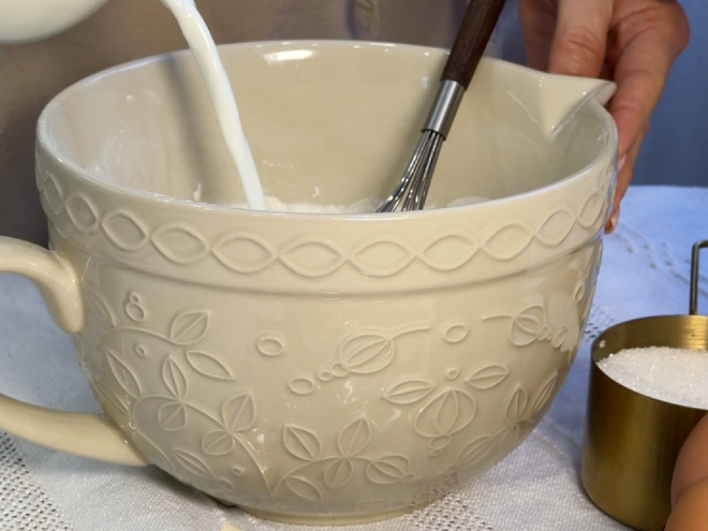 Готовим тесто. Яйцо (2 шт.) разбиваем в миску, добавляем сахар (2 ст. л.), соль (⅓ ч. л.) и перемешиваем их венчиком. В яичную массу выливаем половину молока (150 мл) и вводим просеянную муку (250 г). Хорошо перемешиваем смесь до однородности, чтобы не было комочков.