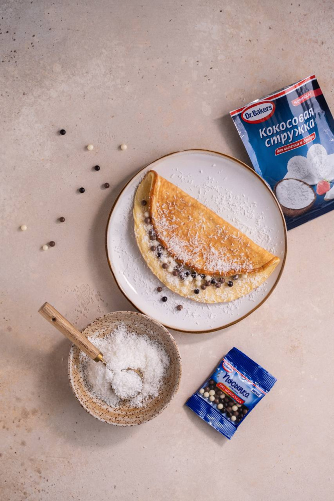 Загибаем омлетный блинчик к центру, посыпаем кокосовой стружкой и украшаем шоколадными шариками. Необычный и вкусный завтрак готов.