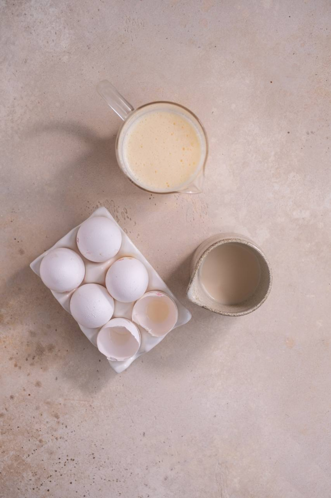 Яйца (2 шт.) взбиваем с щепоткой соли и ванильным сахаром (8 г) до лёгкой пенки.