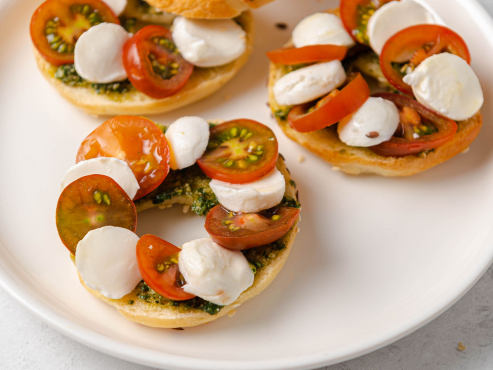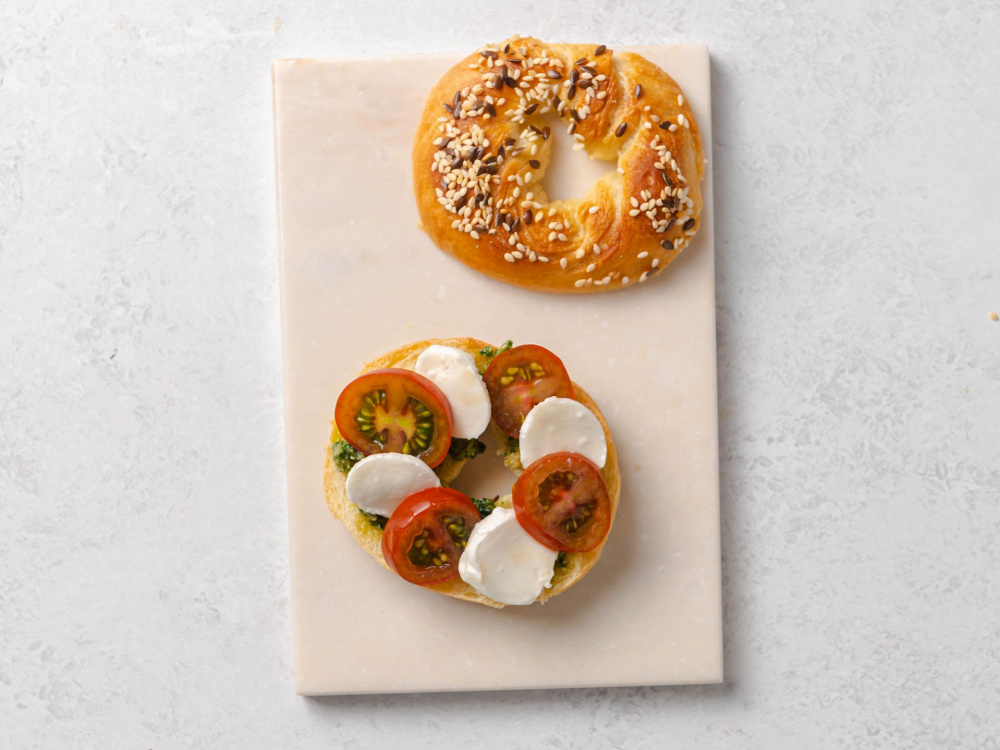 Выкладываем моцареллу и томаты, сверху накрываем второй половинкой бейгла.