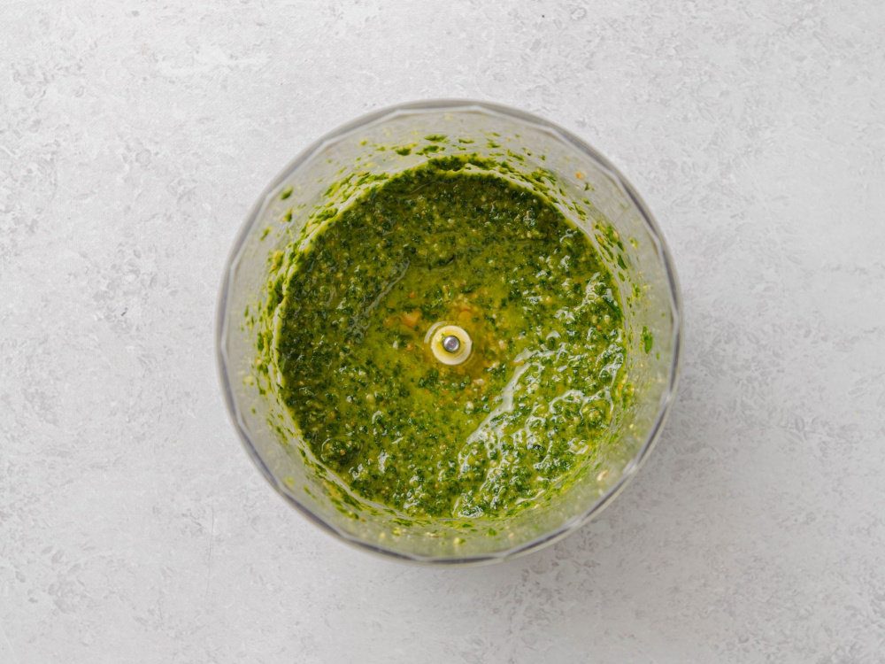 Для соуса песто в блендер кладем 1 пучок базилика, 1 зубчик чеснока, 20 г орехов, оливковое масло (по вкусу) и щепотку соли. Всё взбиваем до состояния соуса.