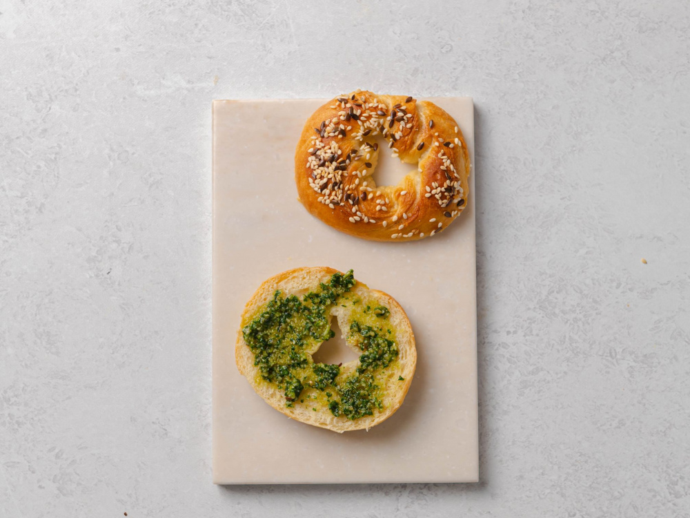 Остывшие булочки разрезаем пополам. На одну половинку намазываем соус песто.