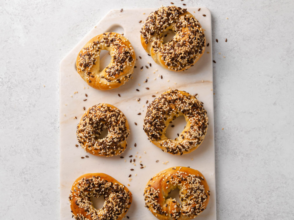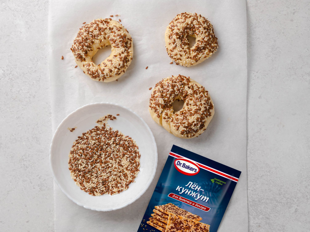 Готовые бублики вынимаем и обмакиваем в посыпке «Лён-кунжут». Кладем на противень, застеленный пергаментом.
