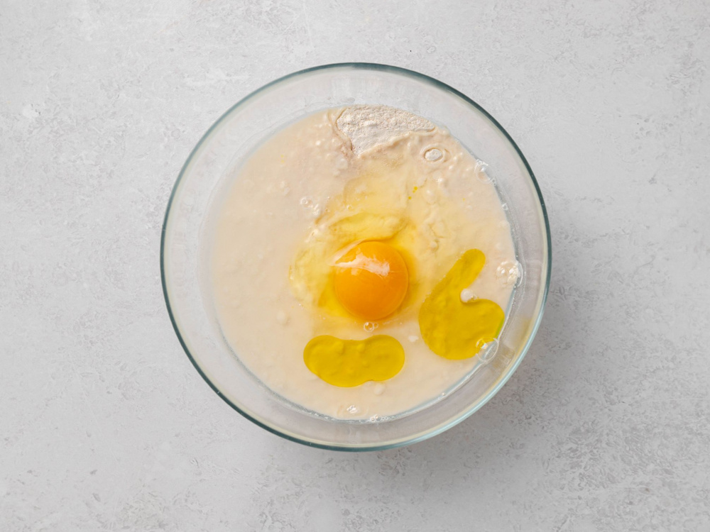 Вливаем тёплую воду (180 мл), оливковое масло (1 ст. л.) и 1 яйцо.