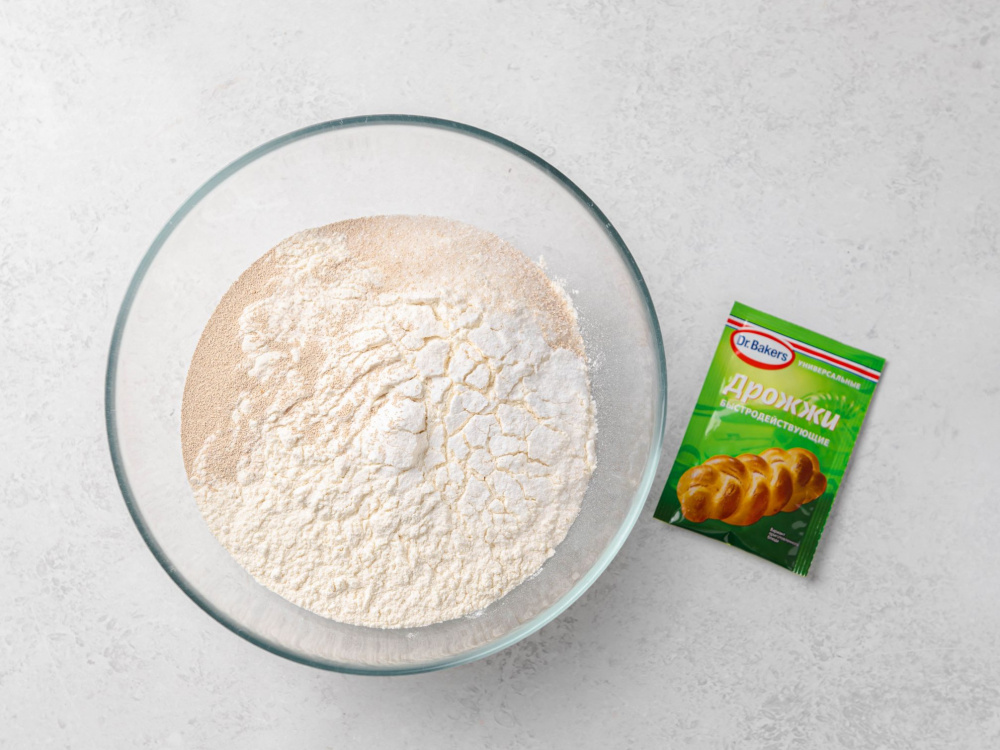 В чаше смешиваем муку (400 г), соль (5 г), сахар (7 г) и дрожжи (6 г).