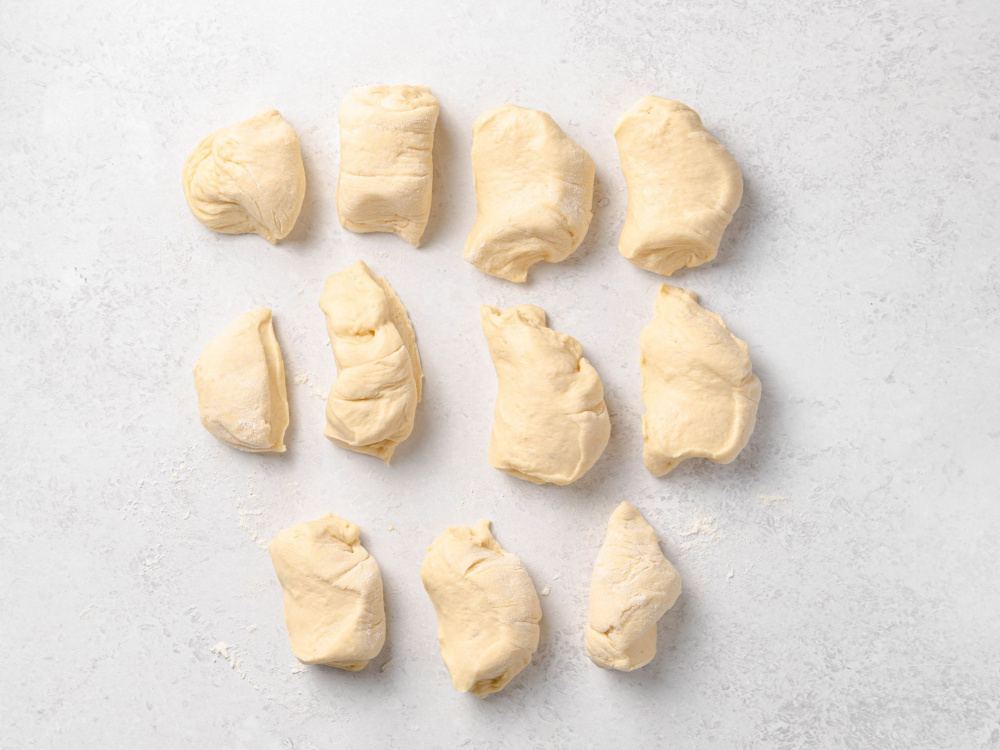 Раскатываем тесто в колбасу и делим на 12 частей (можно и на меньшее количество, в зависимости от того, какого размера булочки вы хотите).