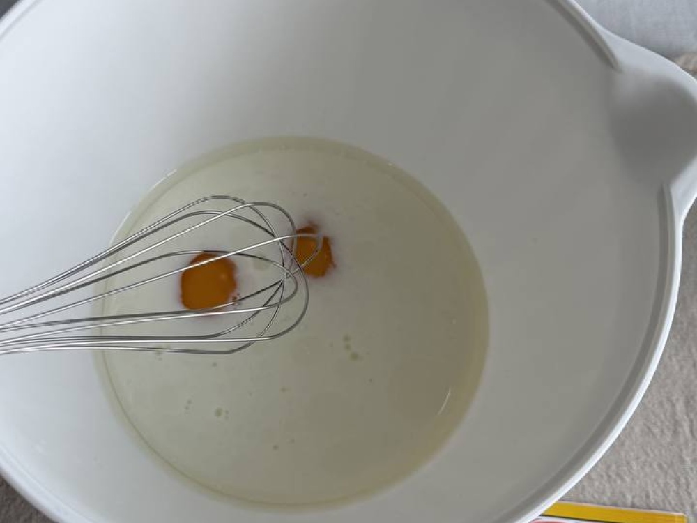 В глубокой миске смешайте яйца, молоко и растительное масло. Используйте венчик или миксер, чтобы добиться однородной массы. Постепенно добавляйте сахар, продолжая взбивать смесь.