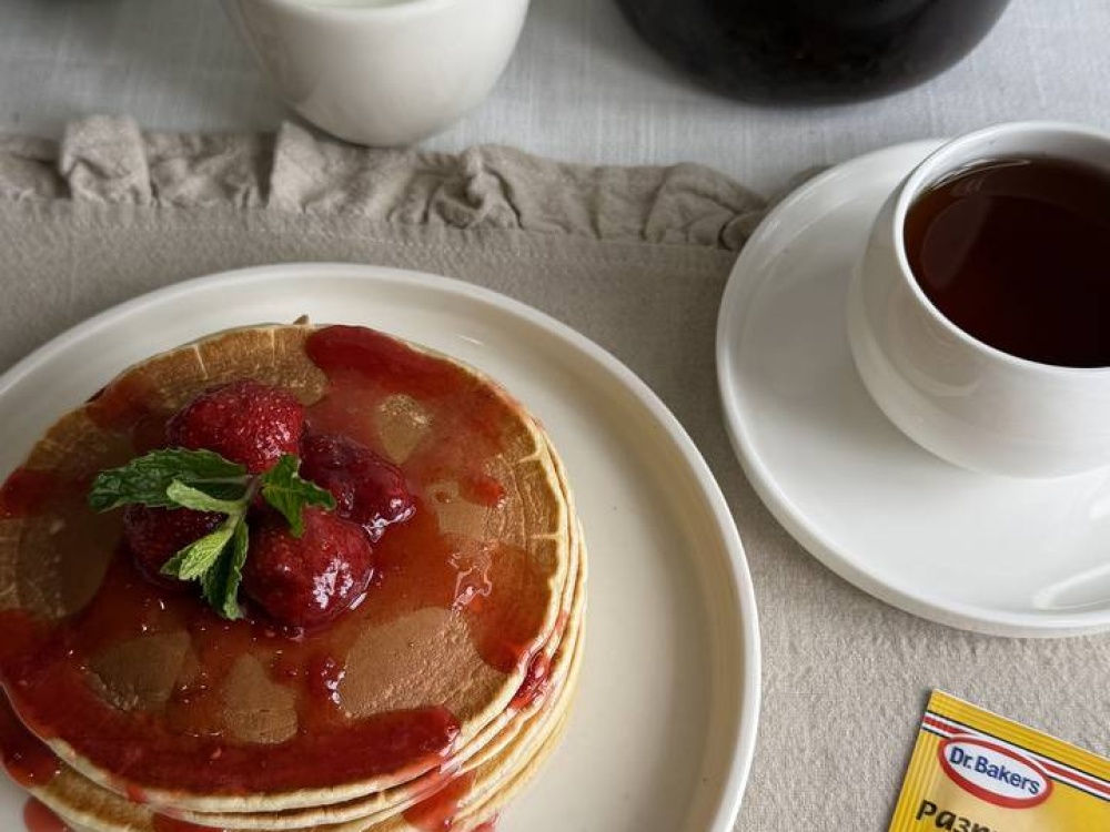 Классические американские панкейки готовы, дайте им остыть, можете полить клубничным топпингом или кленовым сиропом. Идеальны с медом, фруктами или сиропом. Подавайте с чашечкой любимого кофе или какао, и ваш завтрак станет праздником вкуса. Приятного аппетита!