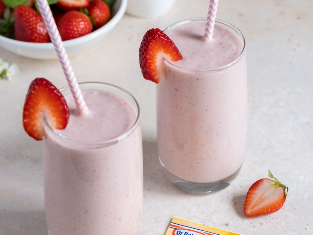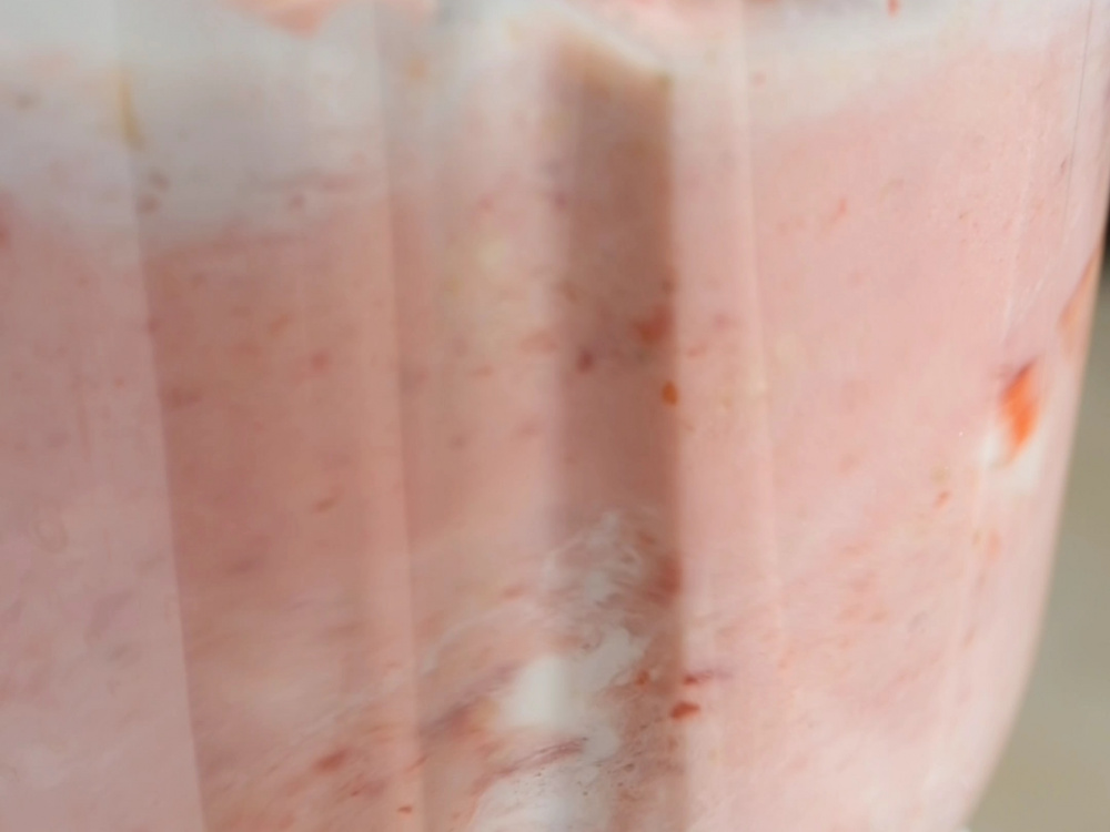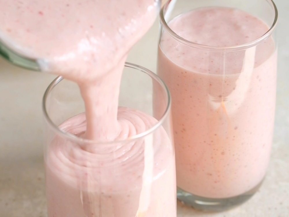 Разливаем готовый напиток по стаканам и украшаем ягодкой клубники.