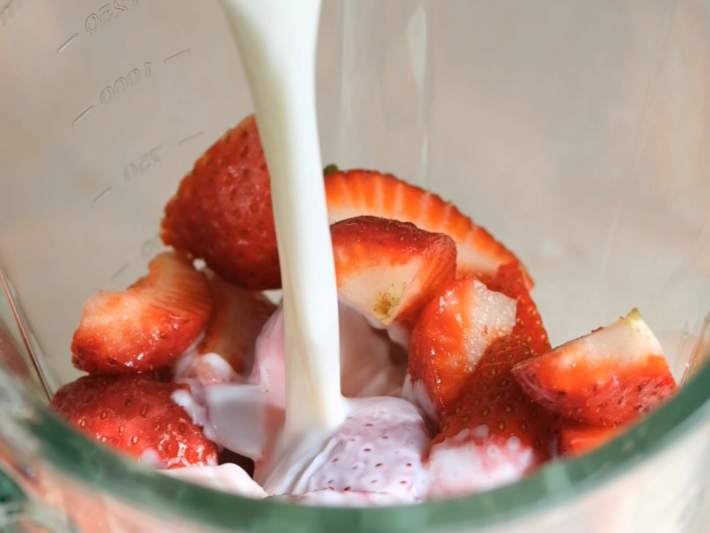Перекладываем в чашу миксера бананы, клубнику, молоко (100 мл), пломбир (150 г) и ванильный сахар (8 г).