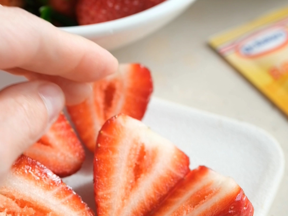 Клубнику (200 г) моем, удаляем хвостики и режем на 2-4 части.