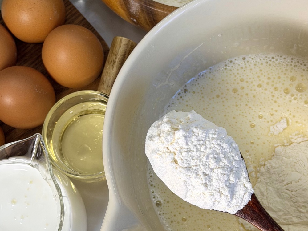 Ввести муку и йогурт (сначала муку, потом подливать йогурт, чтобы не было комочков).