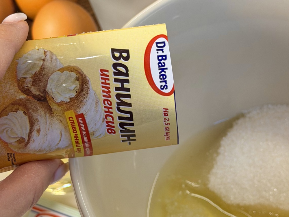 Яйца смешать с сахаром, солью и ванилин-интенсив.