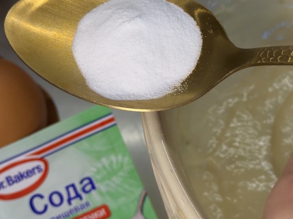 Затем бросить соду погашенную уксусом, дать постоять пару минут, влить масло и можно жарить.