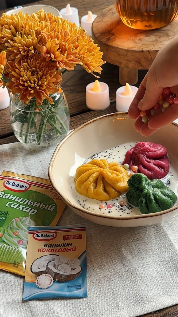 На крем выкладываем сладкие хинкали, украшаем посыпкой и маком.