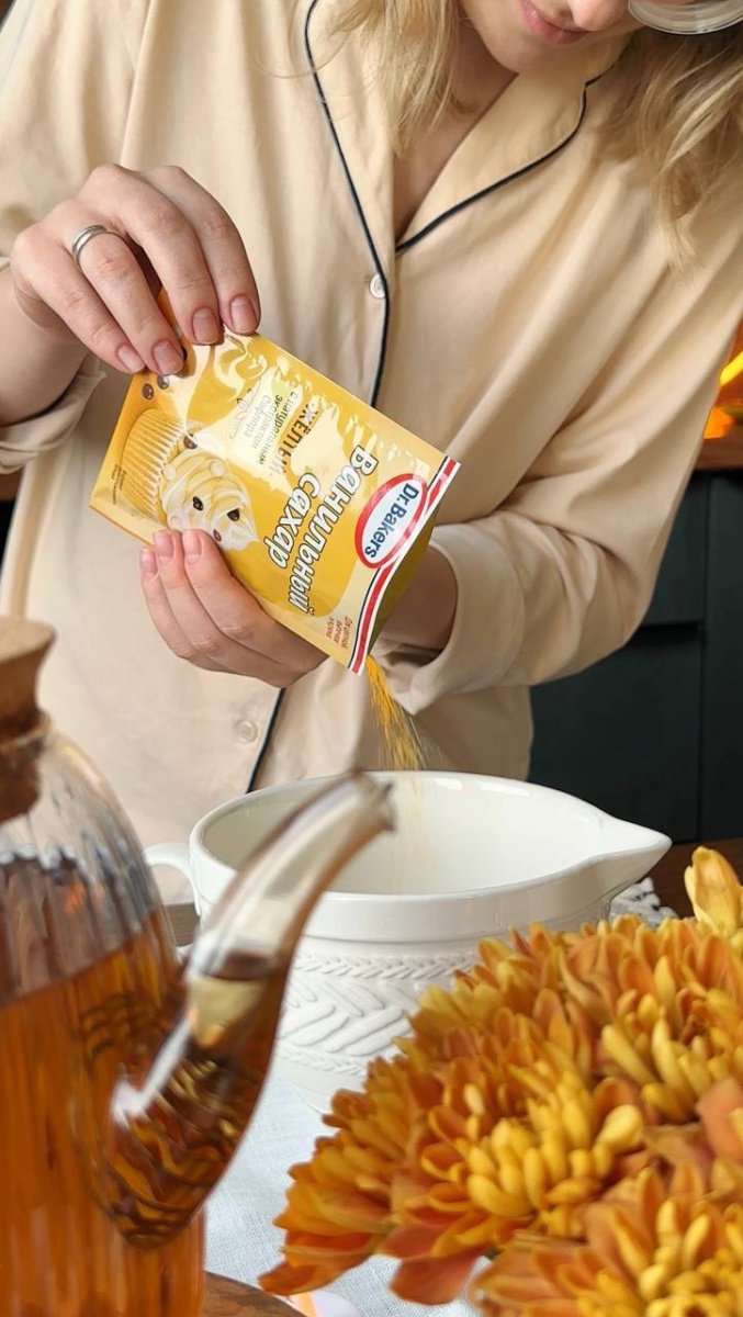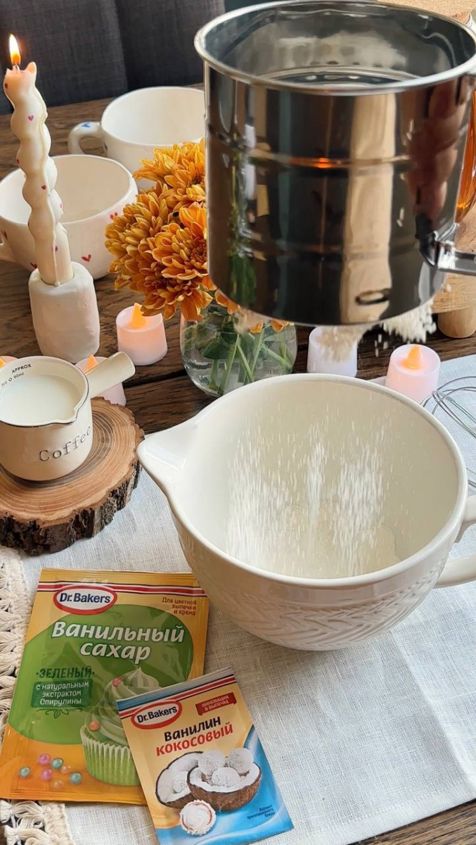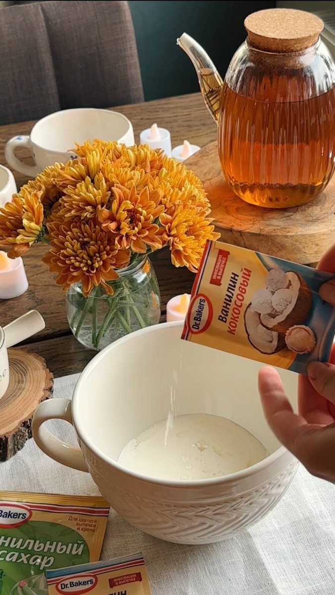 Для крема взбиваем сливки (50 г), сахар (30 г), сметану (50 г) и ванилин (1/2 уп.).