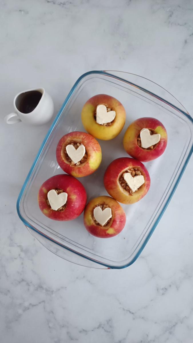 Выкладываем яблоки на противень, протыкаем зубочисткой, поливаем мёдом (1 ч. л. на 1 яблоко). Сверху выкладываем кусочек сливочного масла.