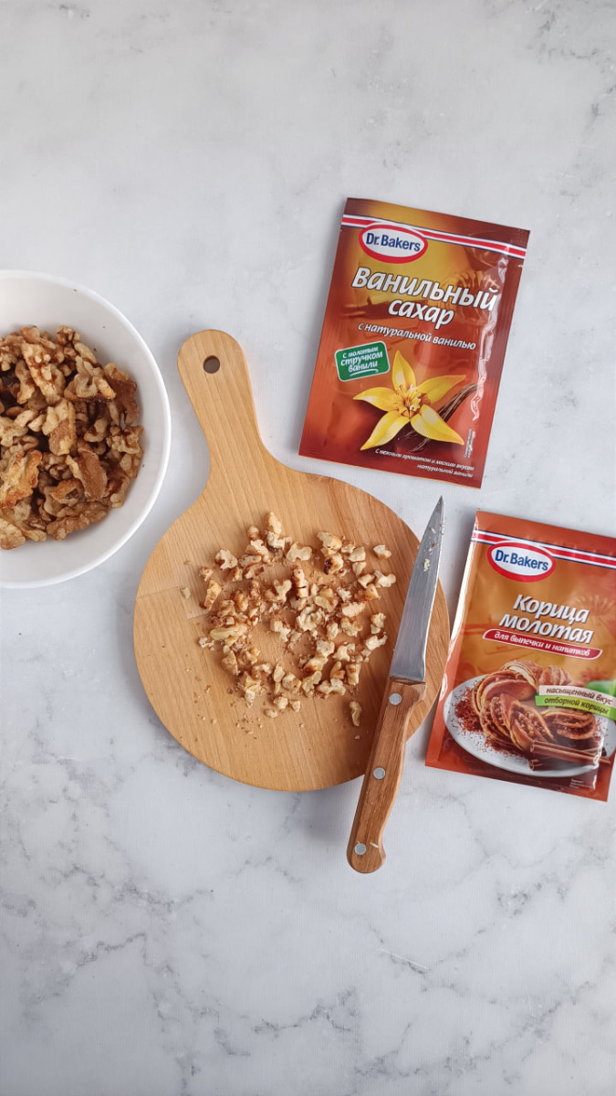 Грецкие орехи (120 г) измельчаем, смешиваем с ванильным сахаром (2 ч. л.) и корицей (1 ч. л.). Добавляем в яблоки.