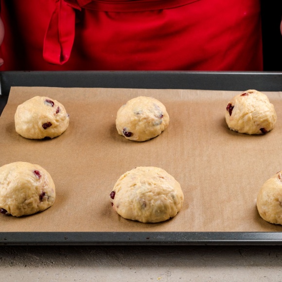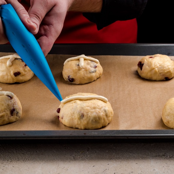Нарисуйте на булочках кресты кондитерским мешком. Выпекайте булочки 30 минут при температуре 200°С.