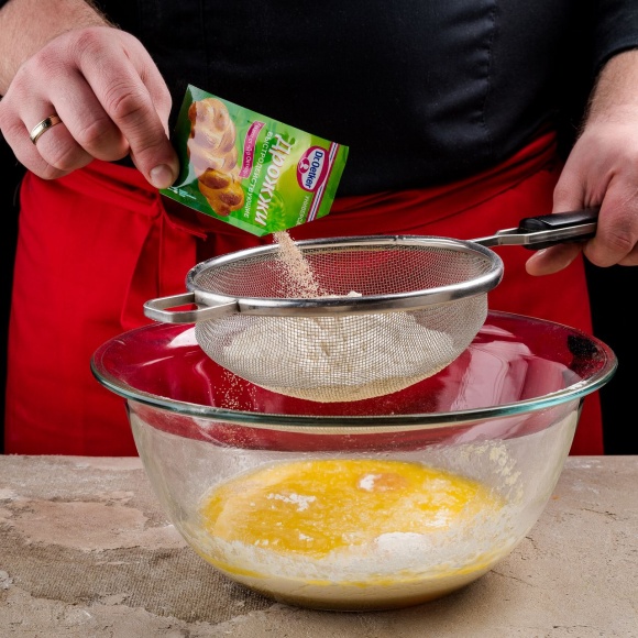 Просейте муку с сухими дрожжами Dr. Oetker и замесите мягкое тесто, при этом муку следует добавлять постепенно.