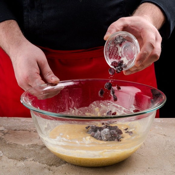 Промойте клюкву и залейте ее кипятком на 15 минут. Обсушите ее, смешайте с небольшим количеством муки и вмешайте в тесто.