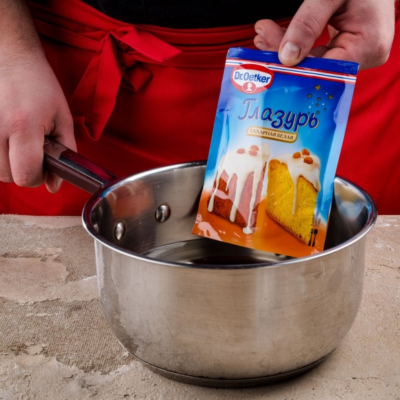 Приготовьте белую сахарную глазурь Dr. Oetker. Опустите пакетик с глазурью в горячую воду на 3–5 минут. Выложите его на полотенце и слегка надавите, чтобы сделать текстуру более однородной.