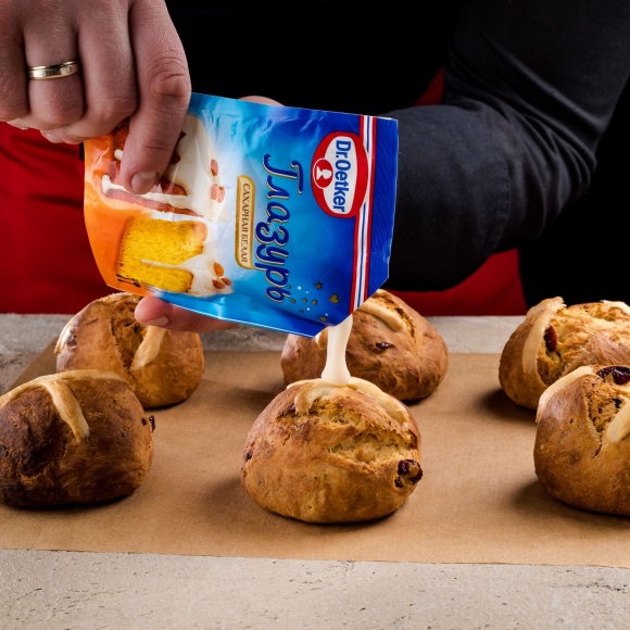 Срежьте уголок пакетика и украсьте глазурью остывшие булочки.
