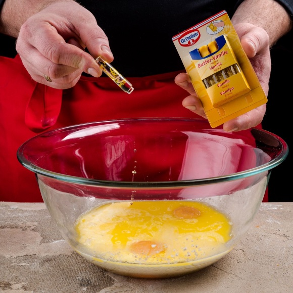 Капните несколько капель ароматизатора «Ваниль» Dr. Oetker в жидкую массу.