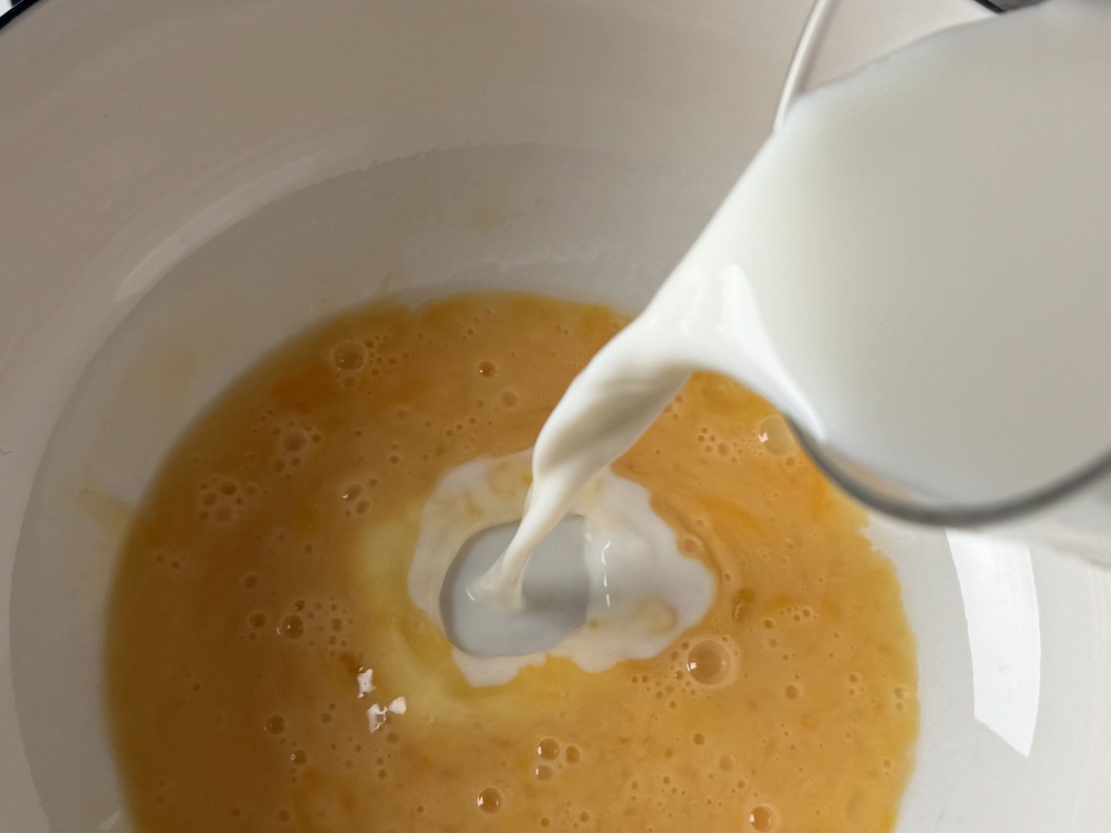 Сначала готовим тесто. Смешиваем яйца и молоко. Растапливаем маргарин и, мешая, вливаем в получившуюся смесь и добавляем муку.