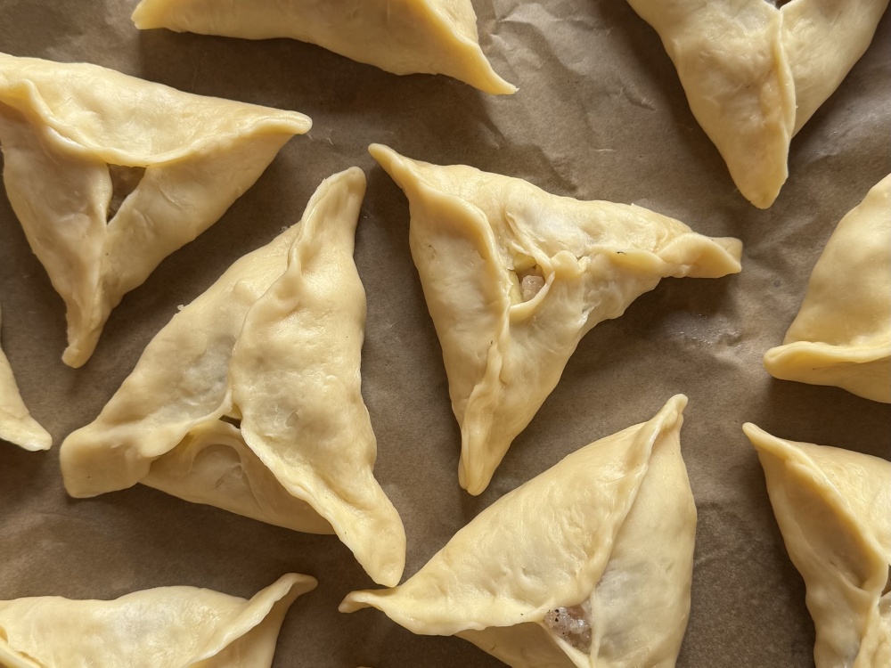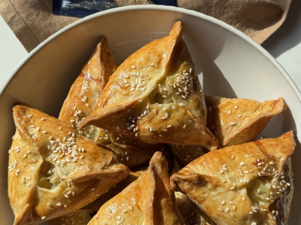 Когда треугольники будут готовы, достаём их из духовки, смазываем растительным маслом (по желанию, так они будут нежнее и мягче). Даём остыть, и приятного аппетита.