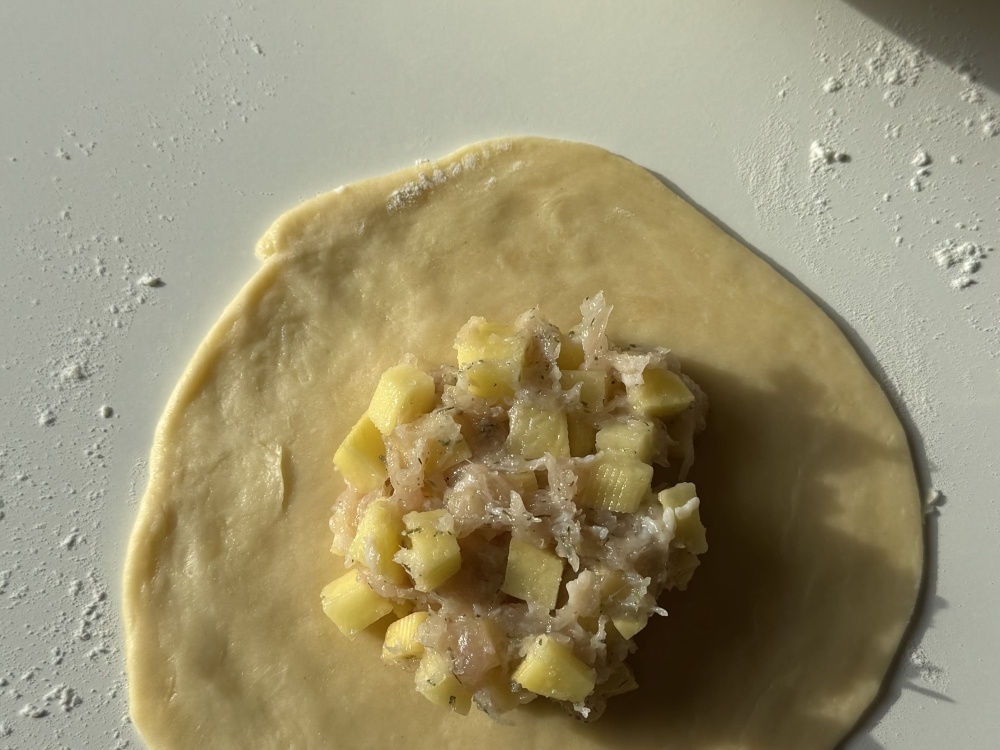 Когда тесто постояло, разделяем его на несколько больших частей. Еще одну часть разделяем на несколько маленьких частей. Все на ваше усмотрение, смотря какого размера хотите треугольники. Берем маленькие части и раскатываем их. Выкладываем начинку и закрываем в виде треугольника.