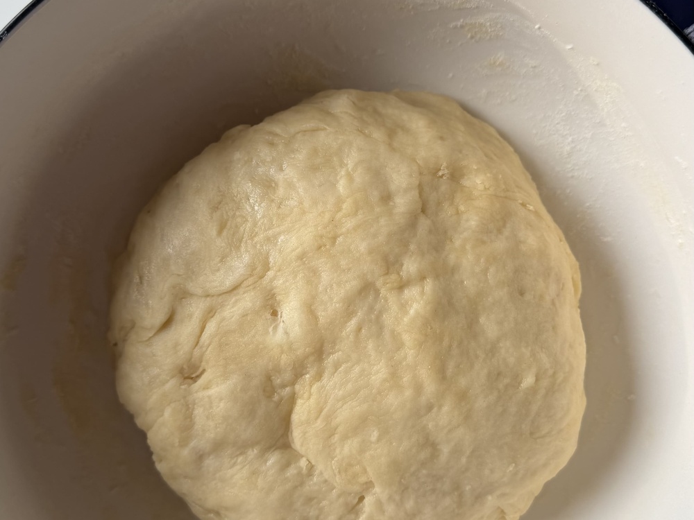 Замешиваем, сначала венчиком, а когда тесто заметно загустеет, выкладываем на доску. Доску предварительно посыпаем мукой и замешиваем руками, пока тесто не станет плотным и эластичным, и не будет прилипать к рукам.