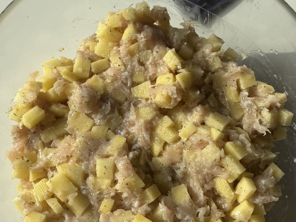 Тесто готово, приступаем к начинке. (Заранее размораживаем фарш и чистим картошку) Картошку нарезаем квадратиками и выкладываем фарш. Растапливаем сливочное масло и заливаем в готовую начинку. Добавляем специи по вкусу и все это дело размешиваем.