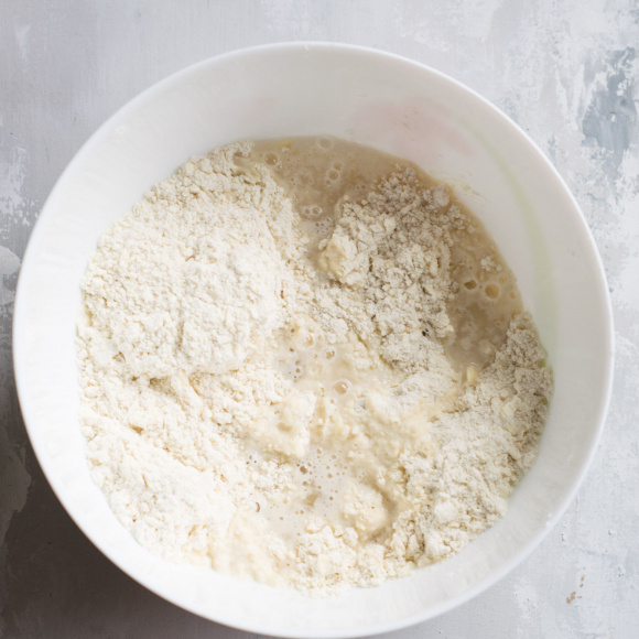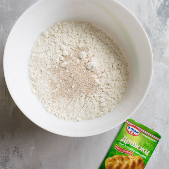 Смешиваем муку с дрожжами и оставляем на 10 минут.