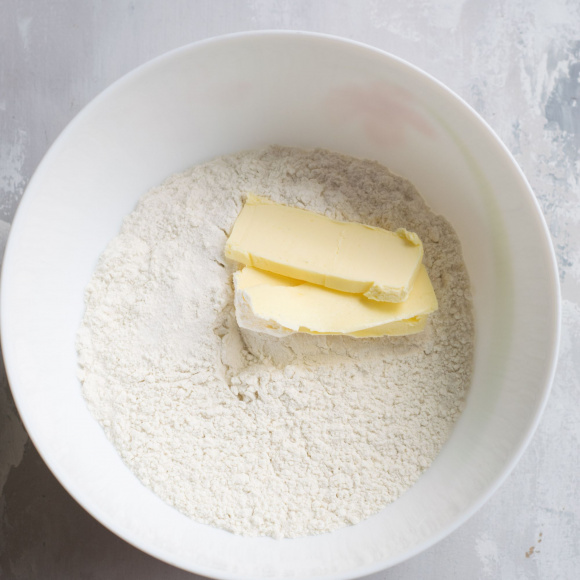 Добавляем сливочное масло в муку и перетираем пальцами в крошку.