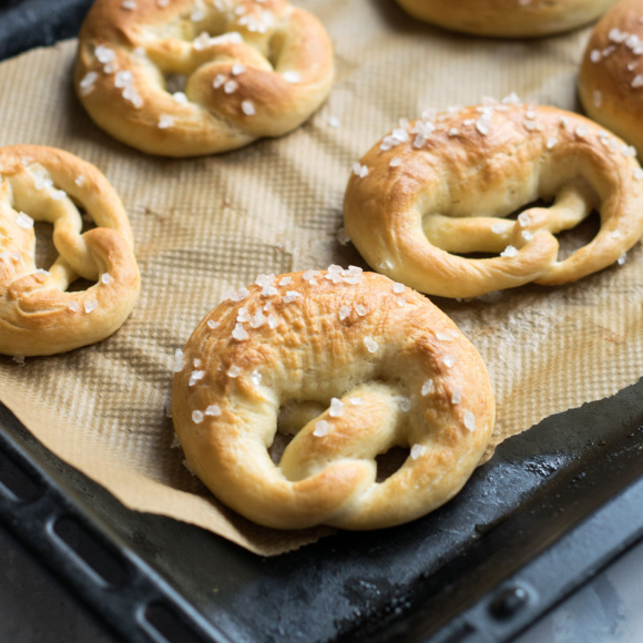 Выкладываем брецели на противень, посыпаем крупной морской солью и выпекаем при 200° 20 минут. --- Приятного аппетита!