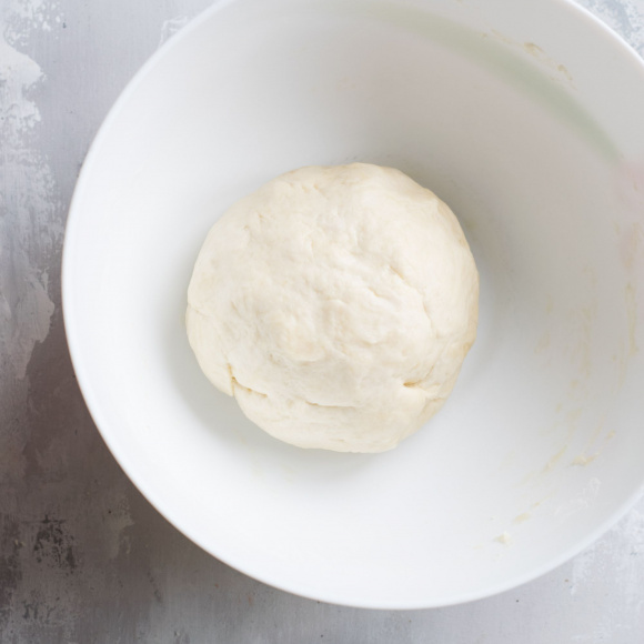 Вымешиваем тесто до гладкости около 7-10 минут. Закрываем плёнкой, оставляем для подъема на 1,5 часа.
